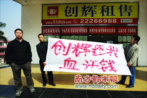 近20位客戶聞訊趕到創輝租售水云軒中山總店追討欠款。店員的統一答復是“追討欠款的業主請到深圳總部查詢”。該公司一名陳姓置業顧問表示,“我們最多虧一個月的工資,還承受得了。最慘的是客戶,有的人怕是一輩子攢下的錢都難指望了。”