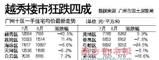 廣州越秀區房價大跳水,一手住宅均價從今年7月的12084元/平方米猛跌至7188元/平方米。廣州市國土房管局調查指出,越秀區房價大幅下降是由兩個低價樓盤的集中交易造成的,專家稱可能涉及內部交易。而廣州市日前公布的最新房地產市場分析報告顯示,廣州全市十區8月一手住宅均價小幅下降至9078元/平方米。