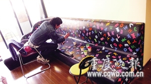 吳女士的家墻壁是在墻體進行人工手繪。與用墻紙、乳膠漆相比,手繪墻畫不僅不會掉色,而且很便宜。吳女士家,四幅墻畫和沙發手繪,一共不到6000元。(記者 陳寒星)