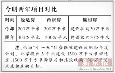 明年北京將建設(shè)300萬平方米經(jīng)適房、300萬平方米兩限房并建設(shè)收購30萬平方米廉租房。其中,經(jīng)適房開工面積比今年增加了100萬平方米。昨日,位于朝陽區(qū)的常營經(jīng)適房、常營兩限房項目同時開工,至此北京今年的保障住房和兩限房的開工指標(biāo)全部完成。