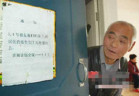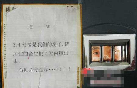 該小區物業辦工作人員說,十天前,小區里突然出現了十幾張通知,落款未寫單位,但內容很恐怖:如果三、四號樓的住戶不搬家,就殺他全家。“整個小區的人都人心惶惶的,特別是三、四號樓的200多個住戶,日夜守在家里,生怕沒人的時候房子被人強占。”該工作人員說。