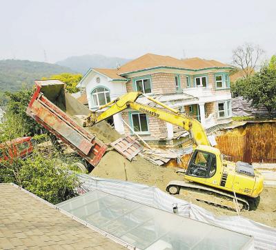 幾百平方米的豪華別墅前,被挖出一個(gè)主體面積370多平方米的地下室,最深處達(dá)3.6米,相當(dāng)于足足多了一套新別墅。昨天,出現(xiàn)在九溪玫瑰園的這一違章建筑經(jīng)群眾舉報(bào)后,由西湖區(qū)拆違辦牽頭對(duì)地下室進(jìn)行強(qiáng)制回填,預(yù)計(jì)回填土方數(shù)千立方米,20輛工程車,預(yù)計(jì)用時(shí)3天,運(yùn)土300余車。