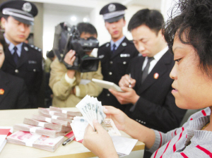 兩名法警立即沖上去,與女子爭(zhēng)奪在一起。最終,女子被帶走,信封被搶了回來,法官從信封里倒出數(shù)十個(gè)建行存折和數(shù)十張銀行卡,并找到一張記錄該公司12個(gè)銀行賬戶的單子,“戰(zhàn)果不錯(cuò)啊!”執(zhí)行法官笑了。