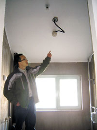 昨天,記者來(lái)到新怡家園6號(hào)樓10層李先生的新居。李先生說(shuō),這幢樓最高為11層,自己家的樓上是一間躍層,而自己家是平層,層高為2.8米。可是等到驗(yàn)收新房時(shí),他們竟然發(fā)現(xiàn)位于北側(cè)的廚房和臥室的屋頂變成了斜斜的坡頂。記者看到,南側(cè)的房屋屋頂都為平的,只是到了廚房和北側(cè)的臥室屋頂突然變成坡頂。而本來(lái)就不大的廚房因?yàn)閮A斜的坡頂顯得更加狹小,靠近窗子處的屋頂距地面的距離僅有1.7米左右,伸手即可觸摸到屋頂。“他們這樣做就是變更了設(shè)計(jì)。”