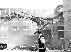 最后,在確定房間內無人無物的情況下,機械設備將五排連體二層住宅小樓中的一棟全部拆除、四棟部分拆除。直到中午十一點,執行工作基本完畢。