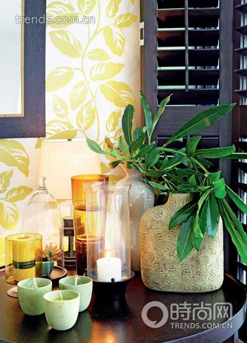 整幅畫面中最為濃重的一筆當屬貼近窗邊的角落,一樣是深色圓茶幾,上面擺放的花瓶十分古樸,插花也顯得更為隨性和張揚。蠟燭不再是單一的白色,茶綠色的三杯小蠟自成一體,身后還藏著黃色的蠟燭與玻璃器皿。