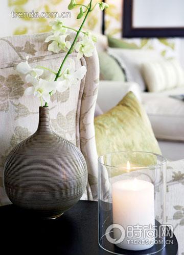 布藝沙發也同樣遵循了花色與純色混搭的原則,奶白色的雙人沙發用淺灰綠的靠包來點綴,分坐兩旁的單人沙發則使用枝葉與花朵的暗紋來處理,旁邊配上深色的小茶幾,精致的圓肚細頸花瓶里悄悄探出一枝素雅的白色蝴蝶蘭,跟玻璃罩內點燃的白色蠟燭相映成趣。