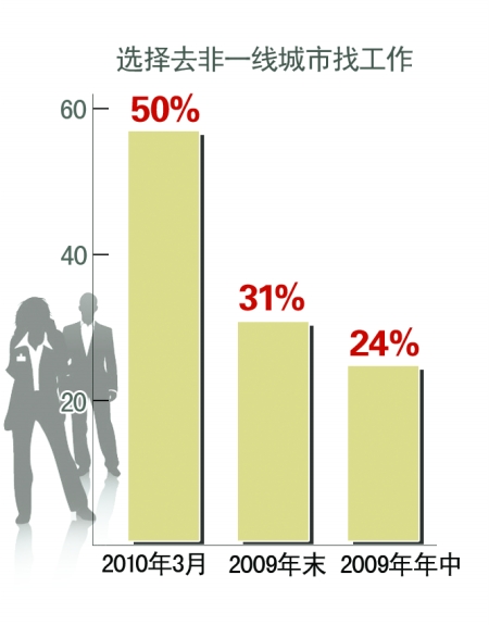 前程無憂組織的“今年三月,去不去一線城市工作”的網上投票中,有50%的人選擇去非一線城市找工作,而這一比例在2009年年末為31%,2009年年中為24%。
