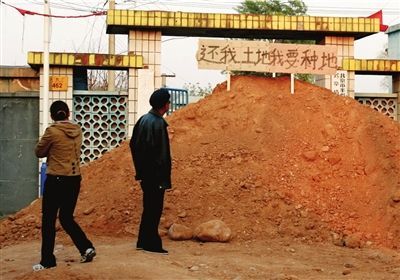 認為村委會未按照占地時的承諾為其置換土地,14日晚,村民靳先生雇車運來黃土,堵住豐臺區長辛店鎮大灰廠村村委會的大門。