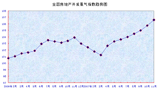由國家統計局按月計算并對外發布的“國房景氣指數”,是全國房地產開發景氣指數的簡稱,由房地產開發投資、本年資金來源、土地開發面積、房屋施工面積、商品房空置面積和商品房平均銷售價格6個分類指數構成。是全國房地產開發綜合發展水平的客觀反映。
