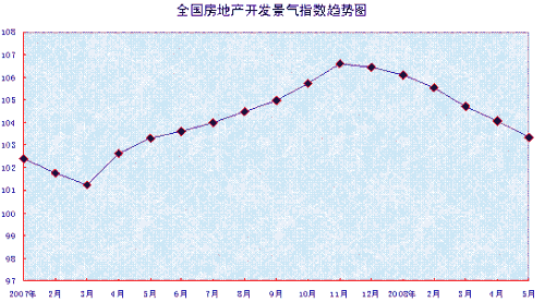 中新網6月18日電 據國家統計局網站消息,5月份,“國房景氣指數”為103.34,比4月份回落0.73點,與去年同月基本持平。