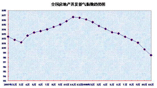 中新網12月12日電 中國信息報今天刊出了國家統計局月度形勢報告《2008年1-11月全國房地產市場運行情況》。月度報告指出,11月份,全國房地產開發景氣指數(簡稱“國房景氣指數”)為98.46,比10月份回落1.22點,比去年同期回落8.13點。