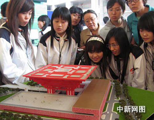 二0一0年上海世博會中國國家館外觀“東方之冠”的模型前,來自石家莊鐵道學院的大學生們對這個類似中國古代官帽的建筑興趣頗濃。