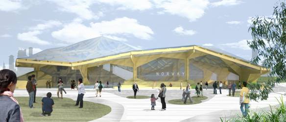 在上海世博會期間,挪威將在世博浦東園區C片區建設占地3000平方米的自建館。挪威此次以“挪威•大自然的賦予”為主題參展上海世博會,展館將由15棵巨大的“樹”構成,模型樹的原材料來自木頭和竹子,并可在展后再利用,充分體現了 “可持續發展”的理念。