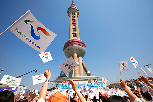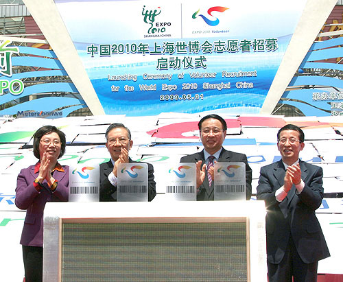 在東方明珠廣場,1500多位曾在上海舉辦的歷次重大活動中奉獻愛心的志愿者和各界市民代表齊集于此,參加世博會志愿者招募工作啟動儀式。啟動儀式前,上海市領導與志愿者代表們一起觀看了在北京天安門廣場舉行的中國2010年上海世博會天安門計時牌揭幕儀式的現場直播。上海市人大常委會主任劉云耕,上海市政協主席馮國勤,中共上海市委副書記、市文明委常務副主任殷一璀,上海市副市長、市迎世博600天行動城市管理指揮部總指揮沈駿共同開通了世博會志愿者招募網站報名系統,全市72個志愿者工作站和上海世博志愿者網等6家網站同時開始面向社會接受志愿者的報名。中共上海市委常委、宣傳部長、市世博會籌辦工作領導小組志愿者組組長、市迎世博600天行動社會動員指揮部總指揮王仲偉發表致辭,歡迎廣大市民和國內外人士踴躍參與上海世博會的志愿服務工作。中共上海市委常委、浦東新區區委書記徐麟,市人大常委會副主任王培生,市政協副主席、世博會執委會副主任周漢民共同為世博會志愿者自行車宣傳隊授旗。