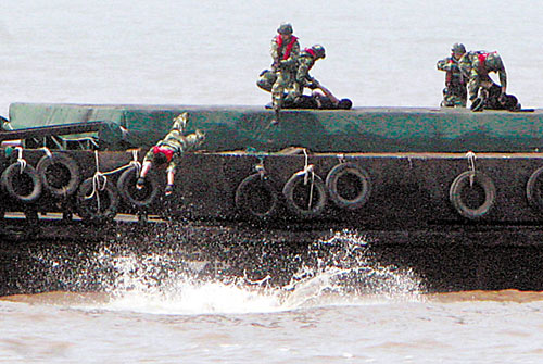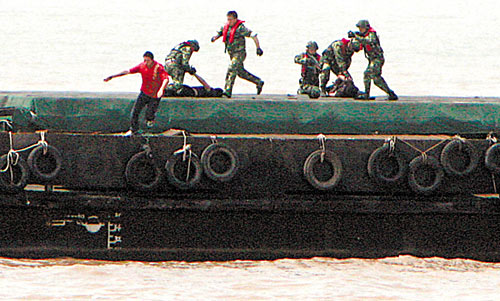 “跳幫!”一聲令下,10余名海警官兵利用兩船靠近和波浪起伏間隙最小的瞬間,飛身魚躍,紛紛越過船艇護(hù)欄,跳到貨輪上。海警擊斃一名“恐怖分子”,制伏兩人,另一名“恐怖分子”慌不擇路跳海,也被飛身入海的海警抓獲。此時(shí)藏匿在機(jī)艙的4名“恐怖分子”瞅準(zhǔn)空隙,駕艇逃竄。