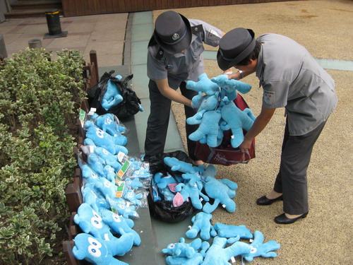 在南京路步行街管理辦牽頭下,黃浦區城市管理監察大隊開展了對南京路步行街各類無證設攤的打擊,一天之內就收繳了200余只假冒海寶玩具。這是城管部門在與上海世博局建立聯動機制后,首次收繳侵犯上海世博會知識產權標志的商品。