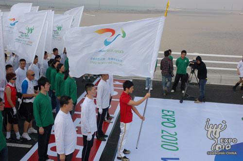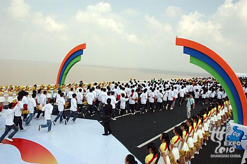 共青團上海市委書記、上海市世博會籌備工作領導小組志愿者組副組長潘敏為“大橋跑”發令起跑。起跑前,21名少女手捧取自沿長江21個城市采集而來的母親河水水樣,匯入長江入?,表達了志愿者的拳拳赤子之心,也表達了志愿者對上海世博會的美好祝愿。