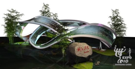 湖南館取名為“桃花源里·Xanadu”——Xanadu英文意為“世外桃源”,是西方世界描述神秘仙境時最廣泛使用的詞。湖南館的展示主題是“都市桃花源”。展館外觀之所以采用雙“魔比思環”相扣的造型,是取義無窮大符號“∞”和中國太極,這與和諧自然的中國理想城市意境以及長株潭城市群“兩型社會”的理念相契合。“魔比思環”是雙環環繞,就單環而言展開長度達100米,高3米,只有一個面和一個邊界。由于主體造型是不規則的建筑環體,對施工和投影都帶來了重大挑戰。