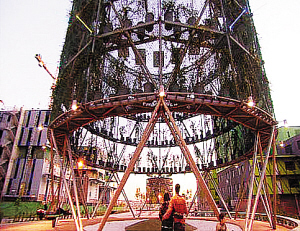 說起城市的標志性建筑,你的腦海中或許會閃現埃菲爾鐵塔、自由女神、悉尼歌劇院、東方明珠、迪拜塔……而對于西班牙馬德里來說,則是竹屋和“氣候樹”。竹屋原是政府提供給低收入人群居住的廉租屋,但它獨特的設計為居住者創造了一種“回歸自然”的原生態氛圍!吧鷳B氣候樹”則是馬德里生態大道三座圓柱形鋼結構建筑之一。“樹”上安放了各種綠色植物,“樹”頂安裝有太陽能電池板。一到夜間,此處就成了音樂的天堂,白天儲存的電力完全可以滿足照明、音響的需要。在世博城市最佳實踐區北部街區,設計師將把這兩個建筑的精髓呈現給參觀者。