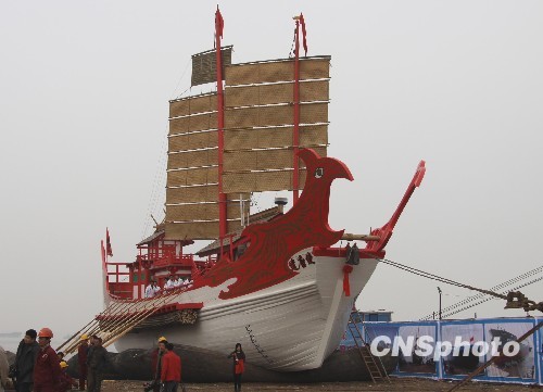 3月31日,由張家港市長(zhǎng)明造船廠仿制的“遣唐使”船成功下水。作為中日友好文化交流的象征,該船將亮相上海世博會(huì)日本館。“遣唐使”船是以日本飛鳥時(shí)代到平安時(shí)代(公元7世紀(jì)~9世紀(jì))的遣唐使船為藍(lán)本仿制的,船長(zhǎng)32.5米、型寬6.8米,由30多名能工巧匠花費(fèi)6個(gè)半月的時(shí)間建造完工,以1:1比例還原了當(dāng)年遣唐使船的大小和結(jié)構(gòu)。中新社發(fā) 朱曉穎 攝
