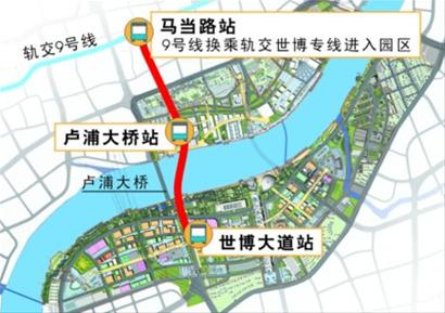 軌道交通世博專用線將在3站兩區間內運行,承擔入園、離園和園區內的越江交通。世博專用線3站兩區間的長度為3.2公里,3個站點分別為內外交通轉換的馬當路站、浦西園區的盧浦大橋站、浦東園區的世博大道站。世博專用線配置6節編組列車4列,運營2列,備用2列,運營時間為9:00—24:00。另外在開園前與閉園后分別提供兩個班次的工作人員通勤交通。