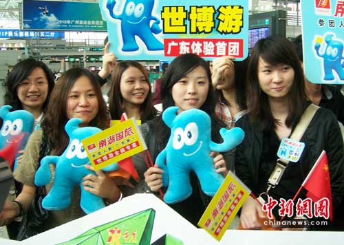 中新網廣州4月19日電 (記者 莫非 通訊員 林月明)4月19日中午,白云機場國內出發廳人氣爆棚,數十名廣東游客首嘗世博游“頭啖湯”,成為廣東進入世博會游覽的第一批游客。