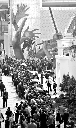 拿到中國館預約券的游客欣喜,沒拿到的也十分平和。錢先生夫婦9時45分入園時,中國館預約券已發放完畢,他們就在亞洲廣場上的預約機上預約了主題館的參觀。“中國館反正是永久性建筑,以后再來看也不遲,”同樣未能拿到預約券的李先生告訴記者。