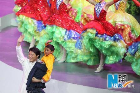 兩位來自青海玉樹地震災區的藏族小朋友也在這時出現在了舞臺上。他們與三個三口之家走到一起,五個孩子手拉著手,深情地緊緊擁抱。舞臺上的演員們“心手相連”,表達了人類必須團結一心相互支撐、攜手面對未來一切挑戰的寓意。