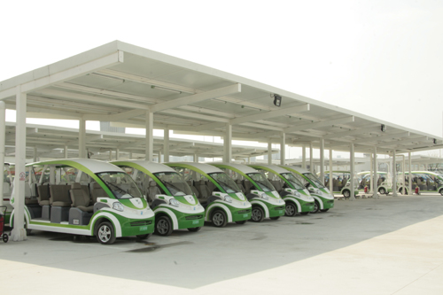 開園首日8點,園區內的環保車停在車場內準備迎接游客