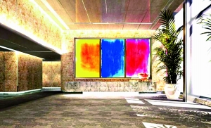 在中國館60.6米層的序廳,作者詩迪創作了紅、黃、藍三幅色調的作品《EXPO2010天水無居·五洲同源》。