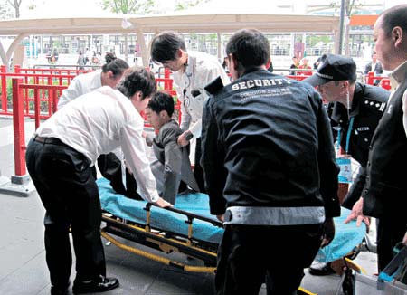 “一名癲癇病人倒在中國館旁!”昨天下午1點58分,一名保安闖入中國館援助中心向工作人員求助。當天值班的賈靚一邊撥打120電話求助,一邊讓同事準備輪椅、急救箱等裝備。6分鐘后,120救走了這名病人。記者昨天從中國館援助中心獲悉,5月1日中國館正式開館以來,這里已經成功處理了諸如病人昏倒、兒童或老人走失、尋物、咨詢及投訴等各類事件百余起,其中日均處理走失案三四十件。本報首席記者 朱文娟
