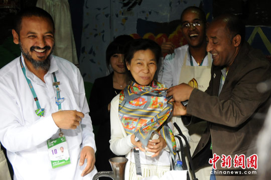 非洲聯(lián)合館管理部部長(zhǎng)陳錦田為張根囡配帶上限量版的榮譽(yù)徽章,并向她贈(zèng)送非洲聯(lián)合館出版的《非常非洲》、《非洲故事》兩本書的首冊(cè)。埃塞俄比亞參展總代表Sisay Getachew還邀請(qǐng)她到埃塞俄比亞展區(qū)品嘗咖啡,并親自為其佩戴當(dāng)?shù)貒怼?/p>
