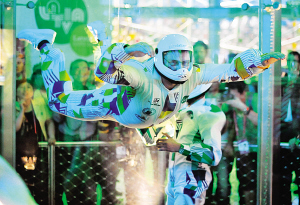 在展館樓上,有一個8米高的“玻璃房子”,一鼓風,玻璃房內的人可以飛起來,風洞的風速可以在瞬間達到20公里/小時,穩穩托舉住“飛人”。在昨天開館儀式后,拉脫維亞總理東布羅夫斯基斯身穿“飛翔服”,戴上頭盔,親身體驗了一回當空中飛人的感覺,將現場氣氛推向高潮。