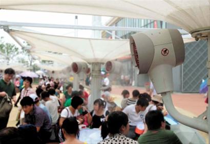 上午園區開放后,記者看到不少游客并沒有急著參觀展館,而是在遮陽棚下的長凳上小憩、喝水、抹防曬露。而撐著遮陽傘排隊幾乎成為“普遍規律”,太陽鏡、遮陽帽也成為參觀者的“標準配置”,有些游客甚至帶著濕毛巾擦汗、降溫。園區內的公園、綠地以及多處噴霧、透水地面、遮陽棚等場所、設施的降溫作用明顯,受到游客歡迎。