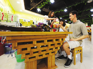 茶文化園內(nèi)20個(gè)展臺(tái)前,均設(shè)有供賓客免費(fèi)品茗、觀賞中華茶藝的休閑區(qū),客人們?cè)诖诵蓓⑵奋耐瑫r(shí),也被繽紛多彩、香味濃郁的各色中華名茶深深吸引,許多人往往會(huì)情不自禁地掏錢買幾份包裝考究、有世博會(huì)標(biāo)識(shí)圖案的禮品茶饋贈(zèng)給親友。比利時(shí)籍華人游客翁先生是食品采購(gòu)商,他逐一品嘗了味道不一的帝芙特伯爵紅茶、薄荷茶、芙蓉茶、綠怡茶,對(duì)這些印有海寶和各國(guó)展館圖案的金字塔形茶葉包裝盒很感興趣,認(rèn)為很有藝術(shù)感,要帶到比利時(shí),讓大家品嘗一番中國(guó)佳茗,為此他一下子就訂購(gòu)了3500份這種造型的禮品茶。據(jù)悉,光顧茶文化園的賓客中,近30%來(lái)自美國(guó)、加拿大、德國(guó)、新加坡、日本、韓國(guó)、尼泊爾等國(guó)家,世博茶文化園已成為外國(guó)賓客了解中國(guó)茶文化的一個(gè)窗口。(江躍中 顧武)