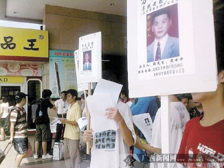 由于自己投資了1000萬元跟南寧市某房地產公司合作開發一個小區,但該公司的法人鄭某竟將上億資金卷走,當事人經過幾年的尋找卻找不到鄭某。昨日,柳州市國泰房產開發有限責任公司法人陳健美采取“非常手段”,帶著公司員工和親戚來到南寧市火車站、朝陽廣場、萬達廣場等繁華地帶,舉著鄭某的照片,懸賞1萬元,“尋找南寧最大的老賴”,此舉吸引了不少市民的眼球。