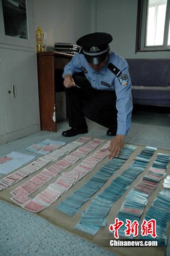 民警在對從劉云、徐其瑞處查獲的假票進行清點
