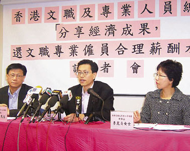 工聯會屬會香港文職及專業人員總會權益委員會在去年9至11月,成功訪問735名會員,包括銀行、證券、保險、會計、教育等從業人員,結果發現:60%人去年獲加薪,另有分別33.3%、22.4%和21%受訪者說,會因“薪酬缺乏吸引力”、“同工不同酬”和“工時越來越長”而考慮轉行或轉工,大多人表示會考慮投身金融界,如證券、銀行、地產、會計等。