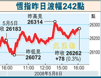 中新網(wǎng)5月7日電 據(jù)香港文匯報(bào)報(bào)道,港股繼續(xù)牛皮發(fā)展,恒指全日收?qǐng)?bào)26262點(diǎn),升78點(diǎn),成交總額進(jìn)一步縮減至702.7億元。證券經(jīng)紀(jì)表示,成交再萎縮,顯示市場(chǎng)買盤乏力,指數(shù)上升只是中移動(dòng)獨(dú)撐大市而已,而且人為因素甚強(qiáng),相信若內(nèi)地或美國一旦有壞消息出臺(tái),恒指將下試25000點(diǎn)支持位。