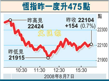 輝立資產(chǎn)管理策略師陳煜強(qiáng)表示,由于全球經(jīng)濟(jì)放緩,股市仍未見可突破的機(jī)會(huì),加上預(yù)期奧運(yùn)期間,內(nèi)地不會(huì)有新措施出臺(tái),估計(jì)恒指短期內(nèi)只會(huì)在22000點(diǎn)左右徘徊。