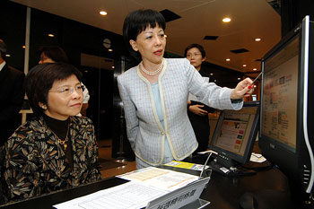 香港商務及經濟發展局局長劉吳惠蘭(左)訪問消委會北角總辦事處時,聽取總干事劉燕卿介紹格價工作。(圖片來源:香港特區政府網站)