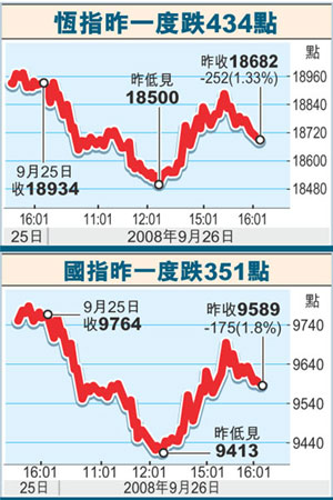 富昌證券總經理藺常念表示,美國仍未通過救市方案,中移動母公司又被國資委抽走500億元人民幣,令市場失去信心,令中移動26日急跌3%。他形容,投資者目前對后市悲觀,紛紛不計價格地出貨套現,就算內地股市跌勢喘定,但美股走勢疲弱下,港股后市絕不樂觀,所以他預計,大市下周將逐步回落至18000點水平。