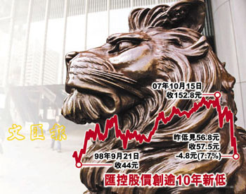 匯控單日急挫7.7%,圖表顯示其有跡象下試50元以下水平,但白韌認為,匯控跌穿60元已經接近底部,雖然匯控表示沒有財政壓力,但卻受制于市場,若早些宣布集資,反而可掃除其不明朗因素。7天以來匯控股價已下跌23%,市值因而蒸發2062億元。