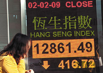中新網2月3日電 據香港《文匯報》報道,外圍下跌令港股結束一連兩天的升市,恒指2日低開84點后再向下,最多跌過545點,收報12861點,跌416點,成交疲弱,只有357億元。