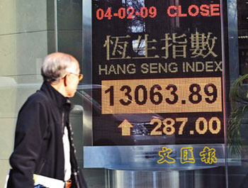 中新網2月5日電 據香港《文匯報》報道,港股跟隨美股及內地股市反彈,大市高開253點,大市在重磅股匯控和中移動雙雙約升2%帶動下,重越13000點,一度升逾330點,全日收報13063點,升287點,成交額365.3億元。