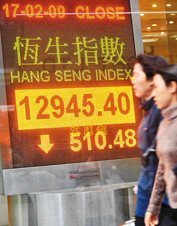 中新網2月18日電 據香港《文匯報》報道,港股A股及亞股17日出現顯著跌幅,其中港股跌穿13000點,收報12945.4點,跌510點,跌幅3.8%。證券分析員指,美股周一休市,外圍股市普遍下跌,加上東亞公布業績,展開銀行業績的序幕,在預計銀行業績普遍差勁下,港股現在至3月中,也難望有好表現。