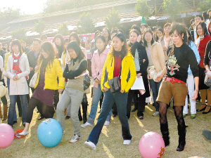 “女士射門男士守門,女士碰到有感覺的就把球踢進去,男士若不喜歡的就把球擋在外面。”在場館一側的場地上,裁判員已經(jīng)開始大聲宣布著比賽規(guī)則。哨音一響,女士們奮力地把球踢向自己中意的“球門”。有一個女孩看上一個戴眼鏡的男生,把球朝他踢過去,由于用力過大,反而一下將他給踢倒了,引來了現(xiàn)場一片笑聲。