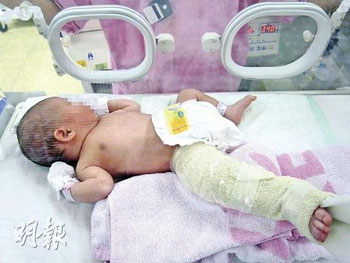 初生女嬰右腿發現骨折后,浸會醫院建議用外托支架矯形。家人懷疑事件是醫護人員疏忽所致,報警求助。(圖片來源:明報)