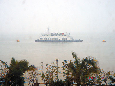 距慶典儀式現場不遠處的海面,停泊著一艘施工船。(圖片來源:香港文匯報)